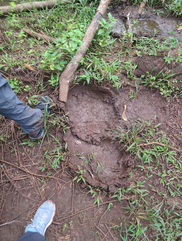 aaaand of course, they are next to the elephant footprints. By the way even an elephant slides in the mud, so that did make me feel better, but then again they balance better than I do and their weight is a natural brake… By the way I measured an elephant yesterday, a healthy one – and belly-measure (behind the shoulders and the nipples…) was 3,70 metres. That puts the footprint into relation.