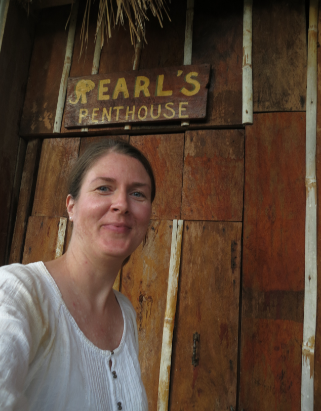 My hut down the hill (a looooong way down the hill), with lots of dorms, but noone in there but me. My room was up the stairs on the first floor. Bathroom is down the path 10 metres. The room’s door didn’t close. At first it didn’t open and I had to go up the hill twice to get help, rather than taking a shower. It’s been a funny ritual that a lot of times I need to get help first and then things work out but a bit weird. Oh and by the way I almost slipped seriously in my superfancy-today-bathroom when getting out of the shower. Not putting a bath-carpet (there’s a bath carpet!!!!) on the floor wasn’t a good idea. And it made me laugh out loud – 3 days trekking in slippery mud and no fall – and then slip in the fancy bathroom of the Mekong Dolphin Hotel. Cheerio, but I failed nicely.