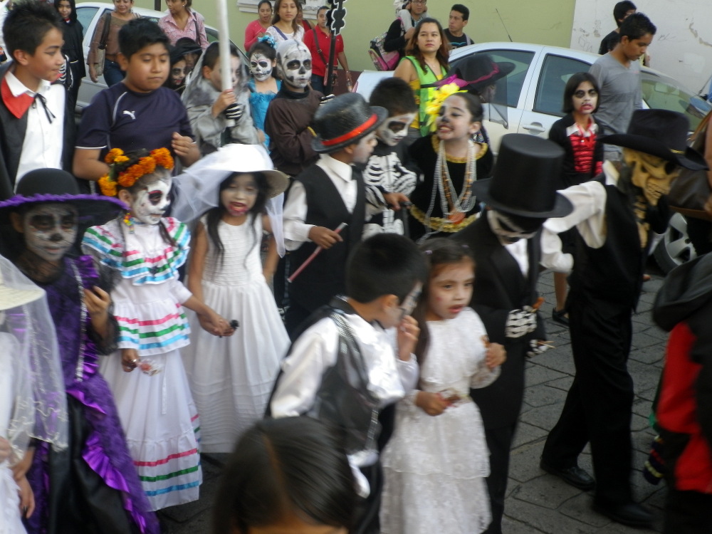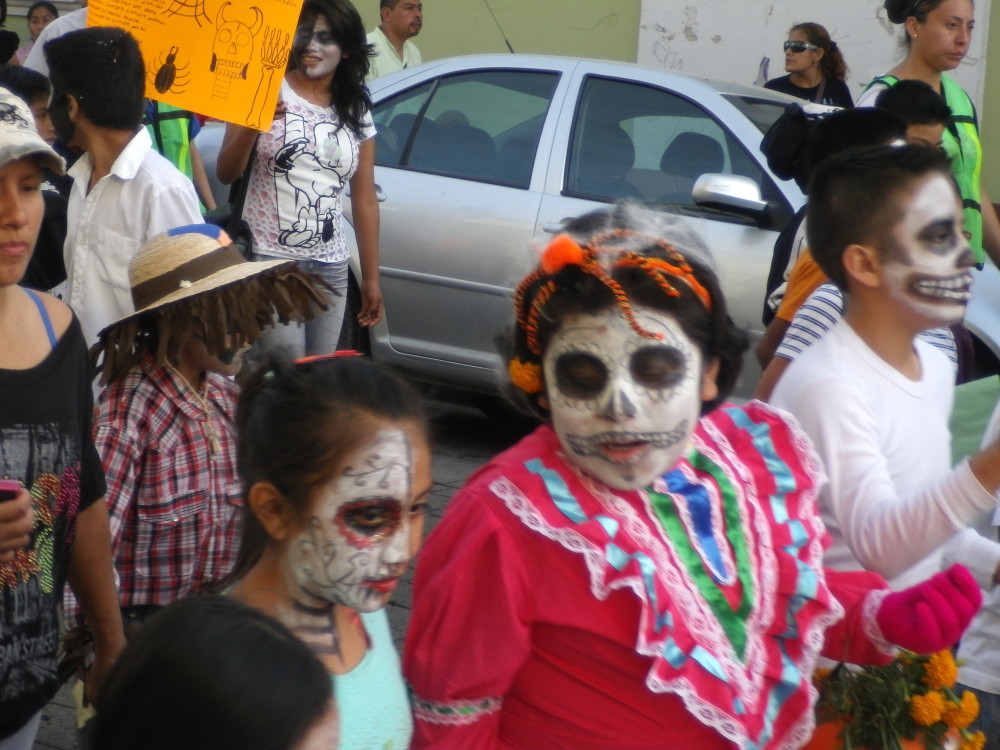 Mariachi-Bands, die jeweils den nächsten Umzugs-Abschnitt anführen – im Zweifel verkleidete Kiddies der lokalen Schule (das waren die Umzüge tagsüber schon am 30. Und mein persönlichen Favoriten).