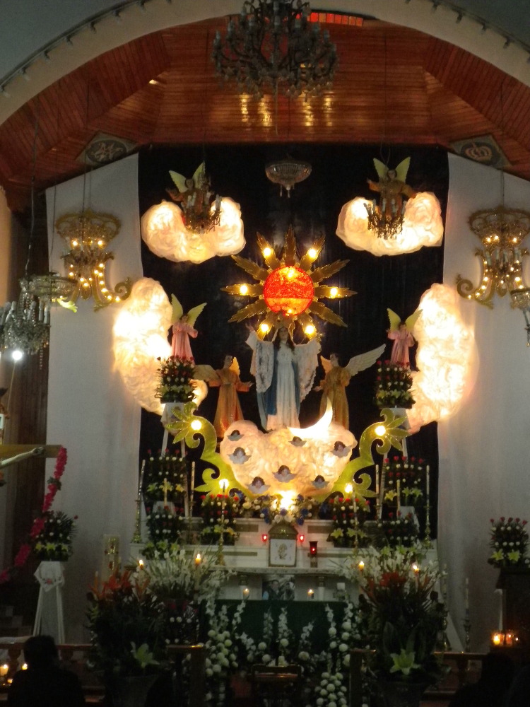 In Chamula waren die Heiligen nicht so leicht bekleidet, und Jesus war nur gemalt in der Kuppel vorn am Altar – dafür mit der Sonne hinter sich. Und neben sich Jaguar, Ochse und noch ein Tier – auch die alten Maya-Symbole.