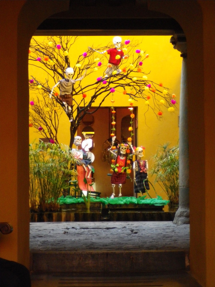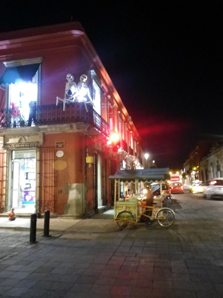 I’ve even gotten used to the skeletons by now. Oaxaca bade farewell to me with its siestas starting yesterday (the 30th!), which was quite amazing. Yet the locals were not dancing along as I had imagined, but a looooot of busy tourists taking pics. Including me. Wait till I have that cable back where it belongs…….. Anyhow I hope Cristobal will be smaller & a little more authentic. As far as I can tell from this morning’s taxi drive – real nice.